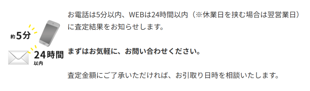 電話なら、日・月曜日以外の9:00~18:00で査定を依頼することができます。