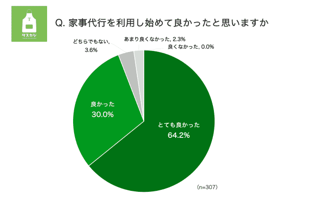 ハウスキーパーの会社を運営するタスカジの家事代行利用の実態調査では、家事代行を実際に利用した人の94%以上が「利用してよかった」と回答しており、高い満足度が示されています。