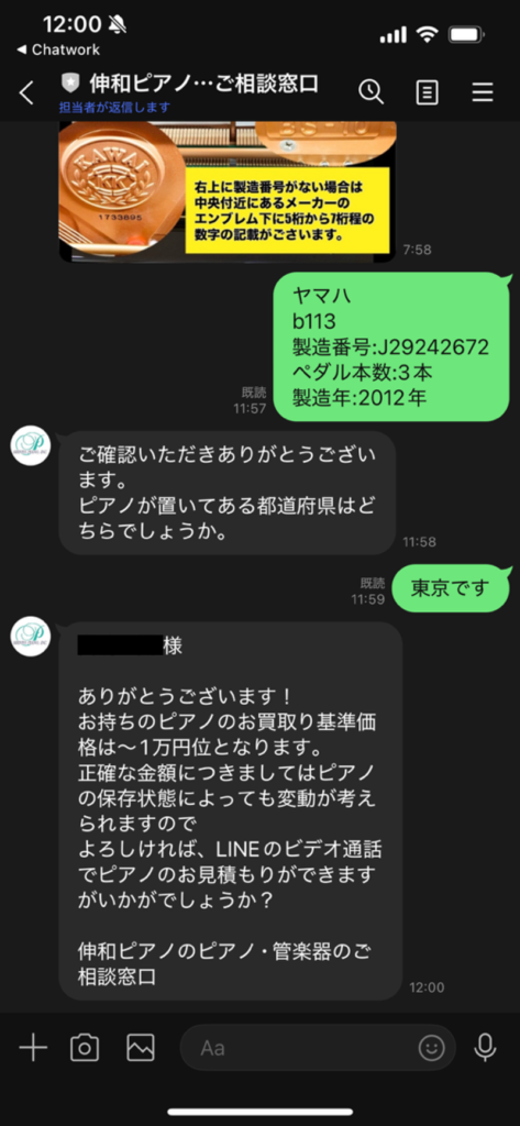 【メーカー】【機種】【製造番号】をLINEで伝えると担当者が該当のピアノの一般的な買取価格の基準の連絡があります。